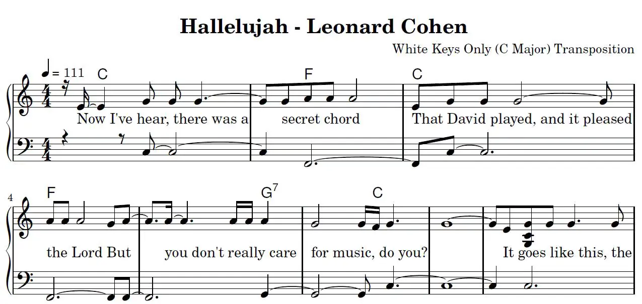 Hallelujah Beginner Easy Piano Sheet Music (White Keys Only, C Major)